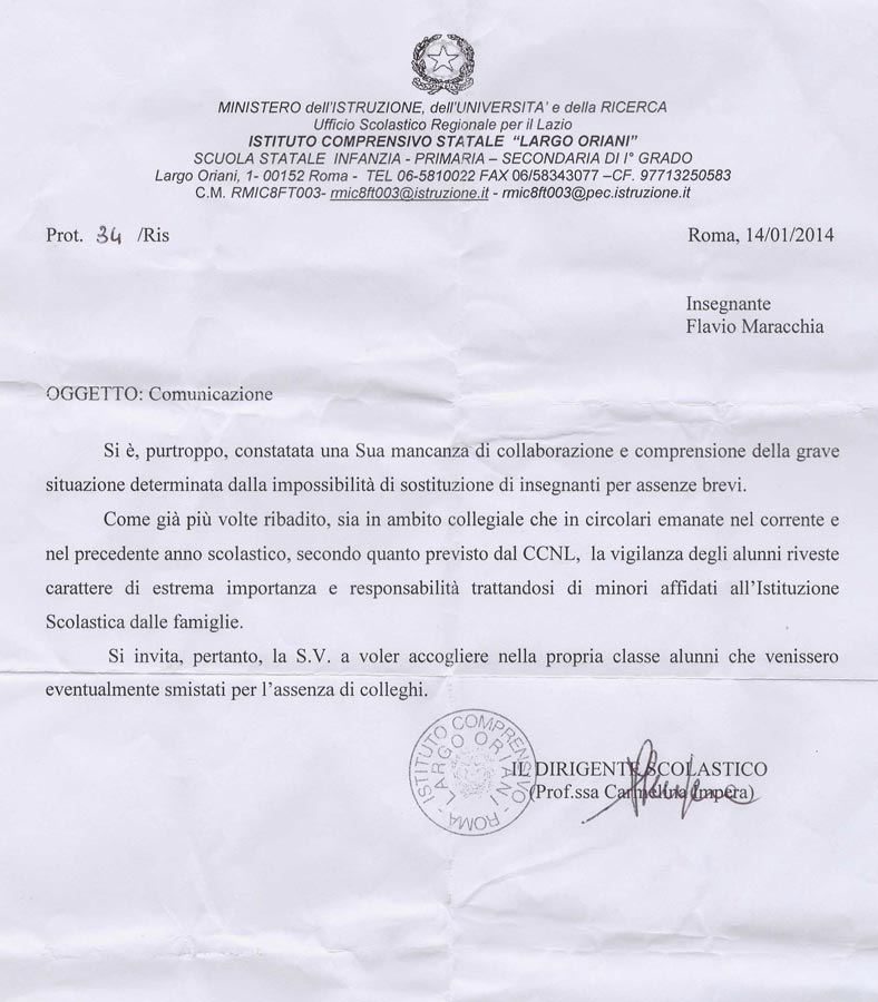 La comunicazione tira in ballo una mia presunta mancanza di collaborazione e comprensione. Bene. Non starò qui a perdere tempo nel tentativo di confutare una tale affermazione e a fare esercizio di bei pensieri sulla mia idea di scuola e sul reale significato del termine collaborazione.